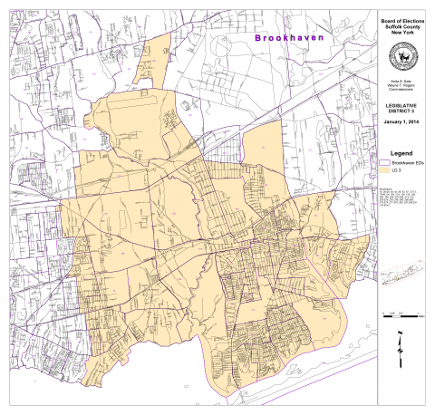 The Third Legislative District of Suffolk County is located in the south-central portion of the Town of Brookhaven.